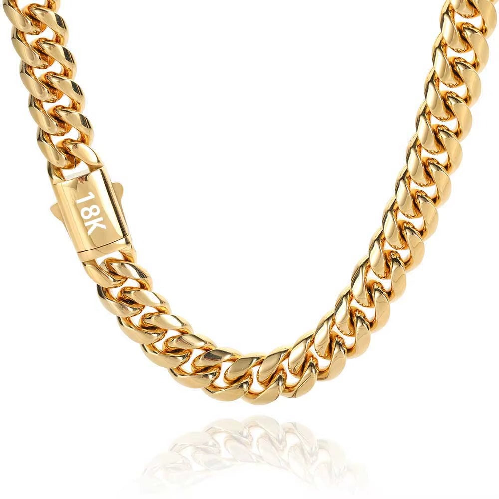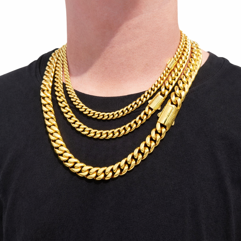 El diseño clásico de cadena cubana la hace perfecta para llevar sola o combinada con otras cadenas, como se muestra en la imagen, creando un estilo moderno y urbano. Su acabado pulido realza el brillo y ofrece una apariencia elegante y llamativa.