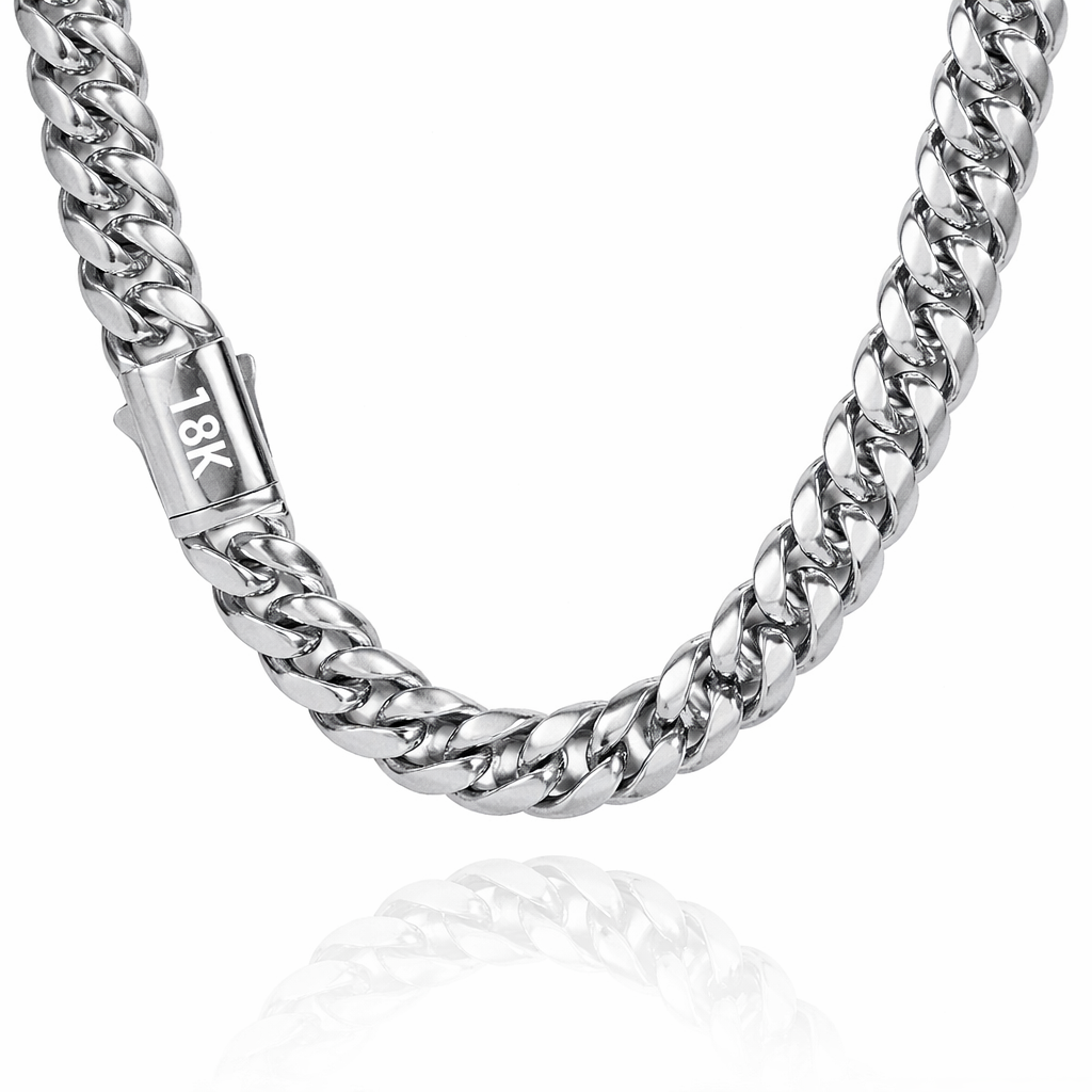 Cadena masculina de estilo cubano con acabado dorado/Plateado brillante, diseñada para aportar presencia, carácter y un toque premium a cualquier look. Su estructura de eslabones gruesos y compactos transmite fuerza y seguridad, convirtiéndola en un accesorio protagonista.