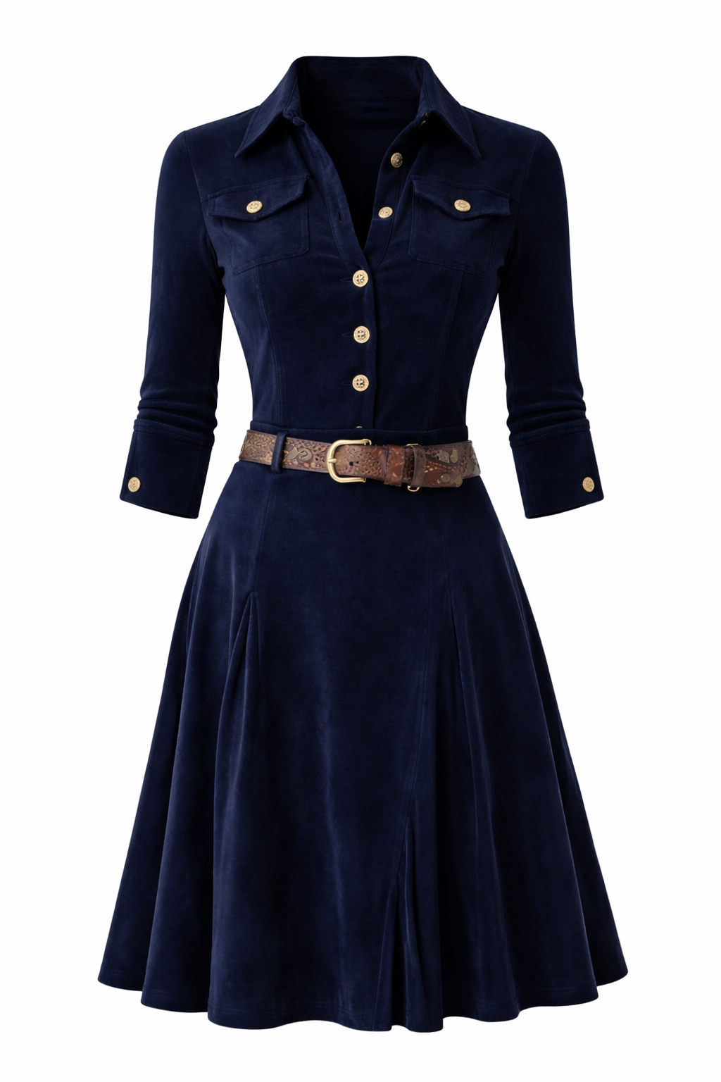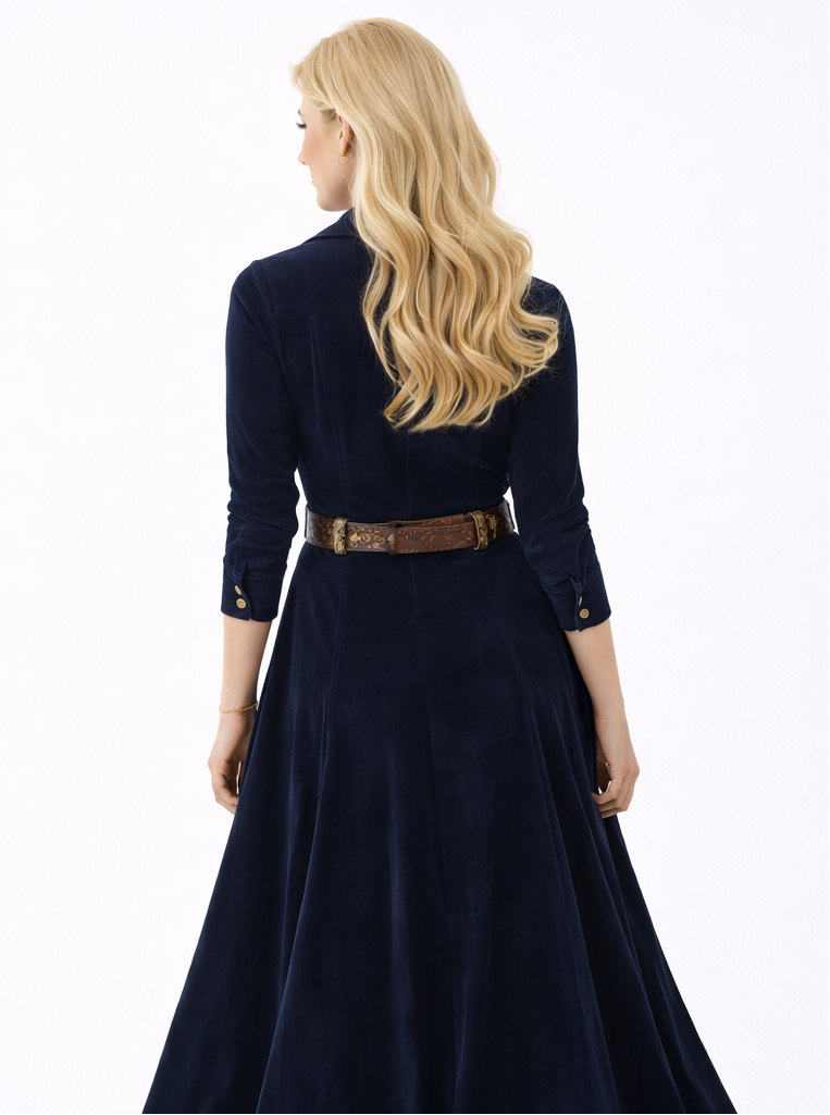 Este precioso vestido largo combina una elegancia sofisticada con un toque de encanto western moderno. La parte superior entallada, adornada con elegantes botones dorados, realza sutilmente la cintura, mientras que la falda amplia y acampanada aporta un aire fluido y femenino.
