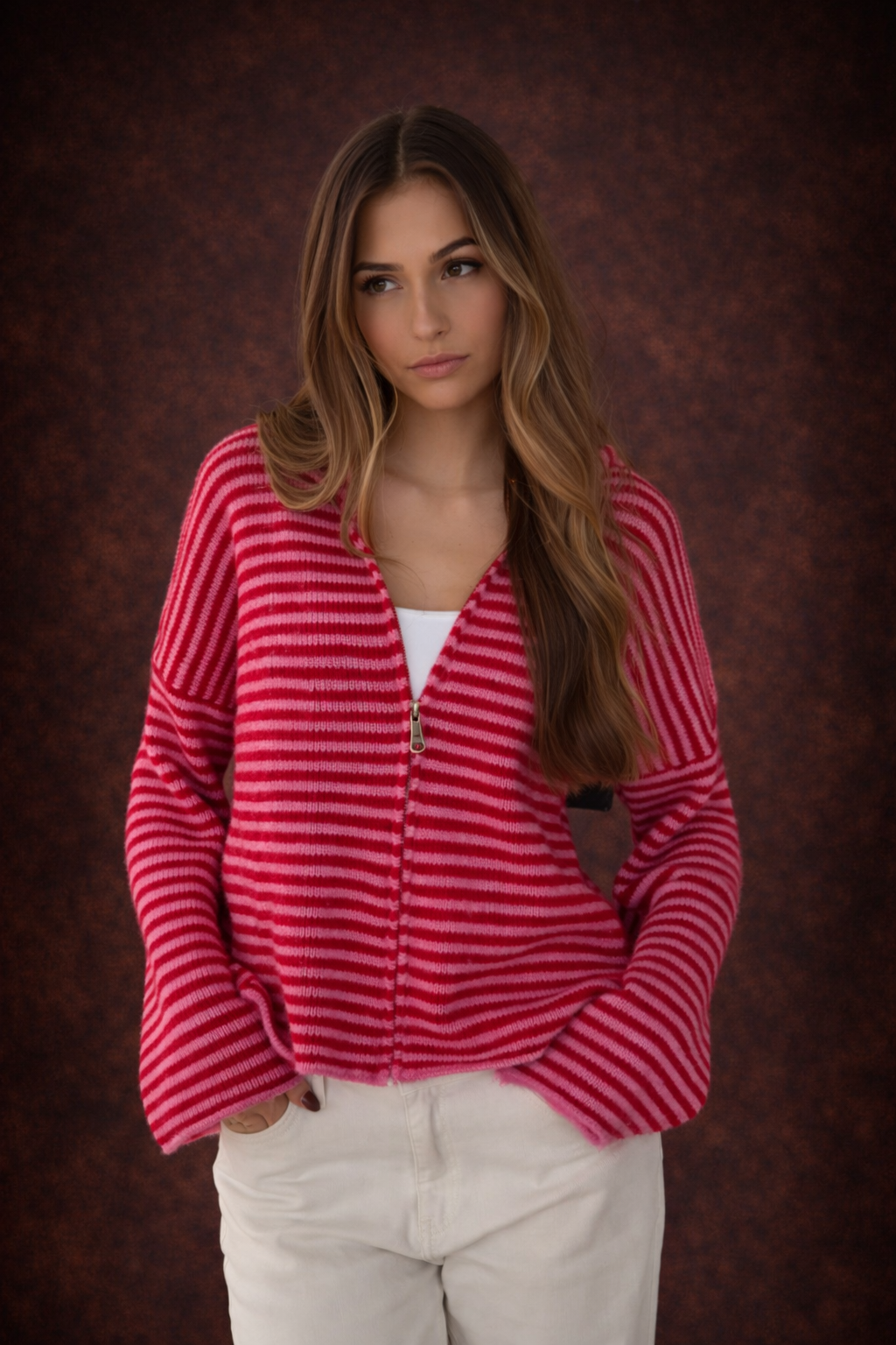 Dale un toque de color y personalidad a tu outfit con esta chaqueta de punto de rayas en tonos rosa y rojo , una prenda cómoda, versátil y perfecta para realzar cualquier look diario.